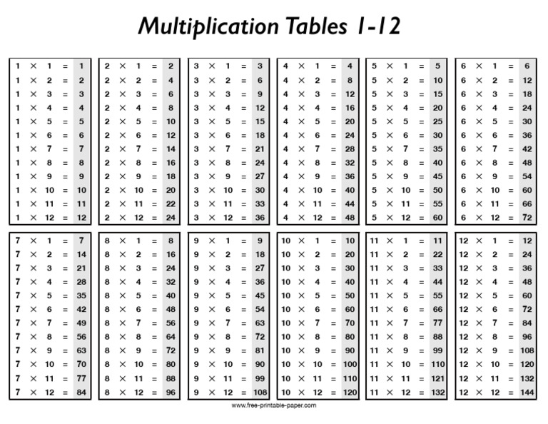 Free Printable Multiplication Table Pdf Worksheet 1 to 12