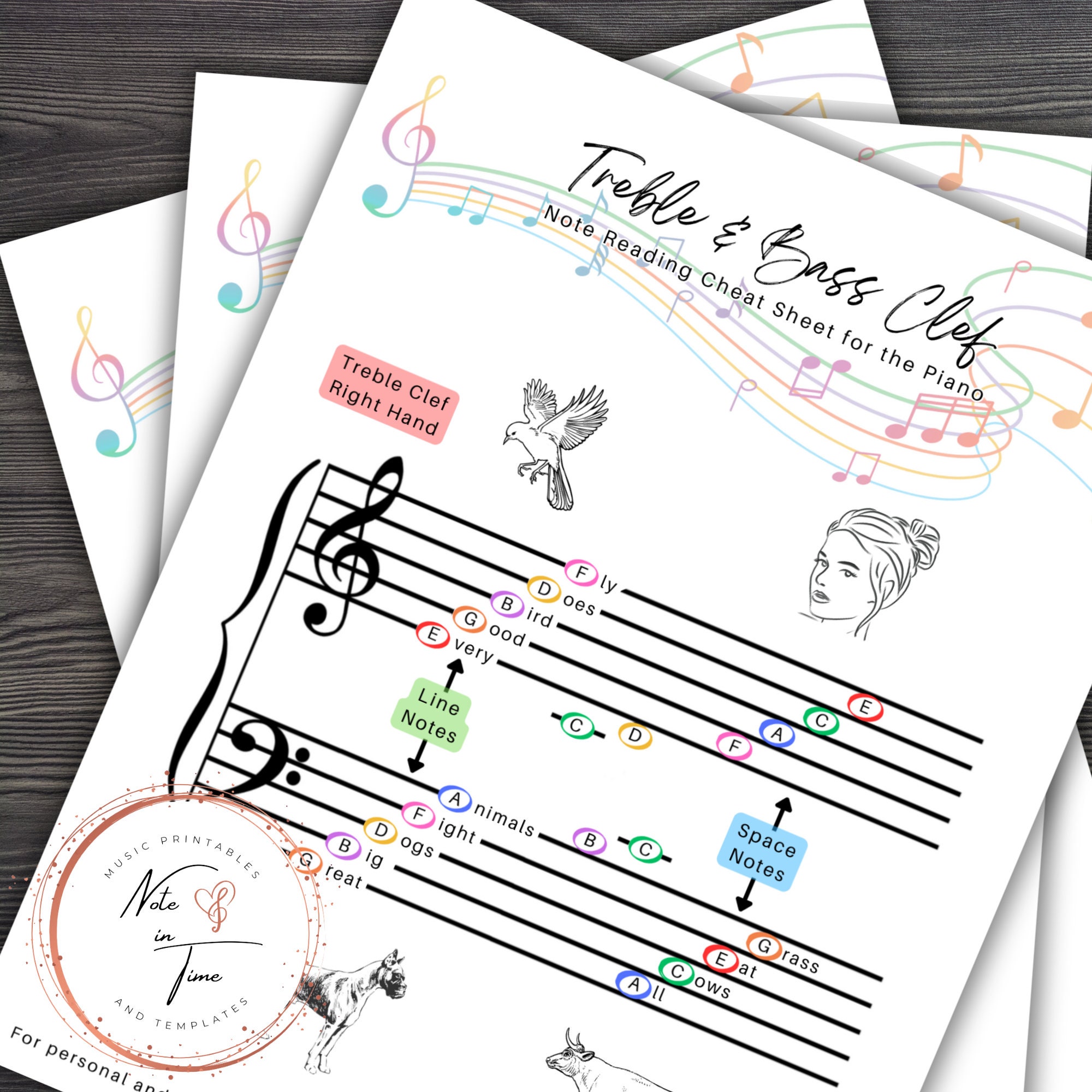 Treble Bass Clef Note Charts Printable 5 x7 Script Etsy
