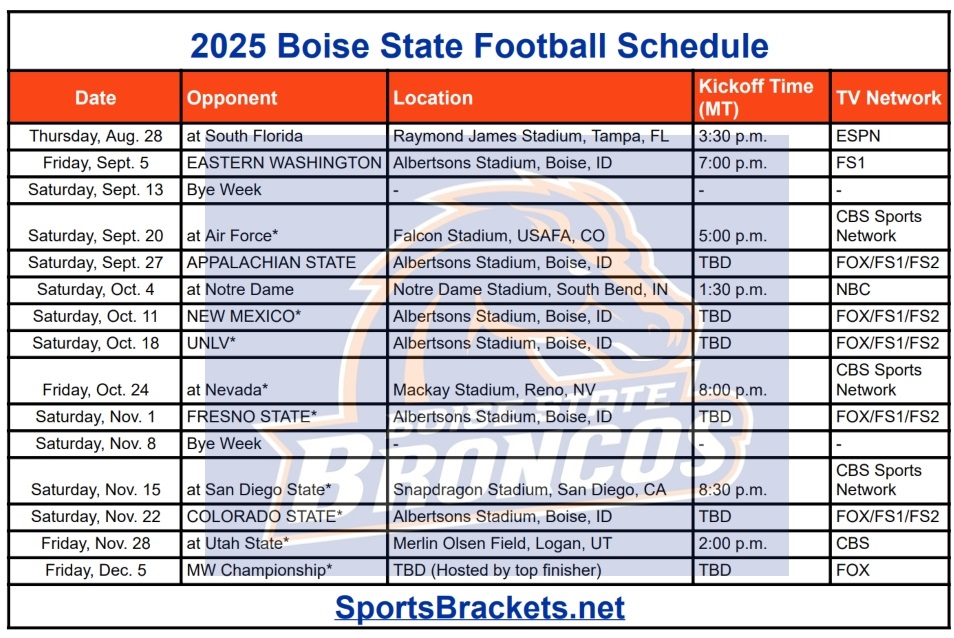 2025 Boise State Football Schedule Printable Matchups and TV Sports