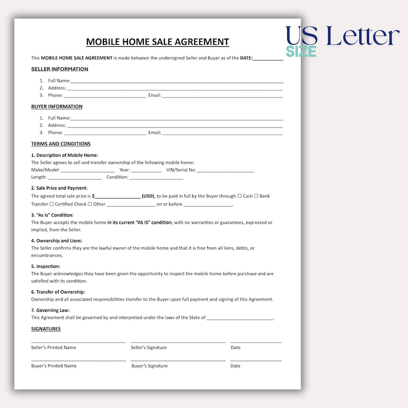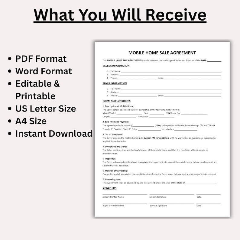 Mobile Home Sale Agreement Template Editable Bill of Sale PDF Legal