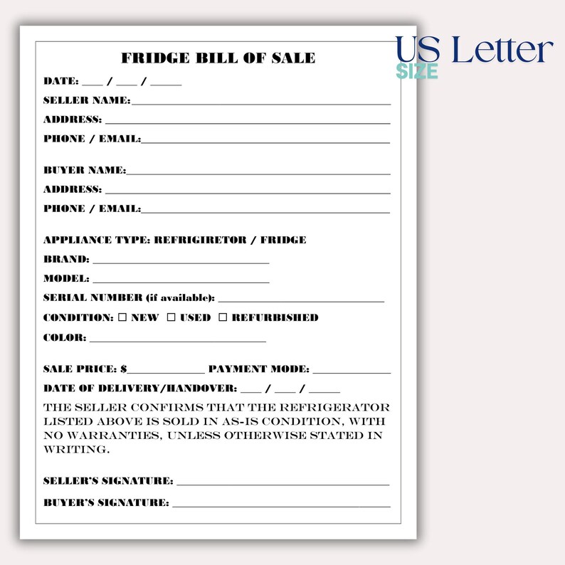 Fridge Bill of Sale Template Refrigerator Appliance Sale Form PDF