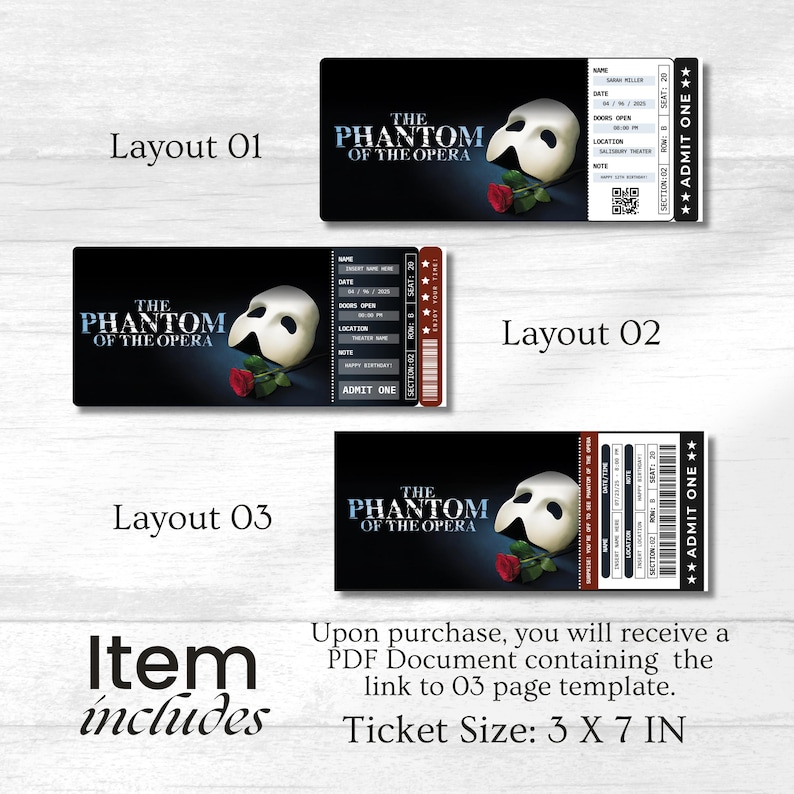 Printable Phantom of the Opera Ticket Editable Tickets Musical Fake