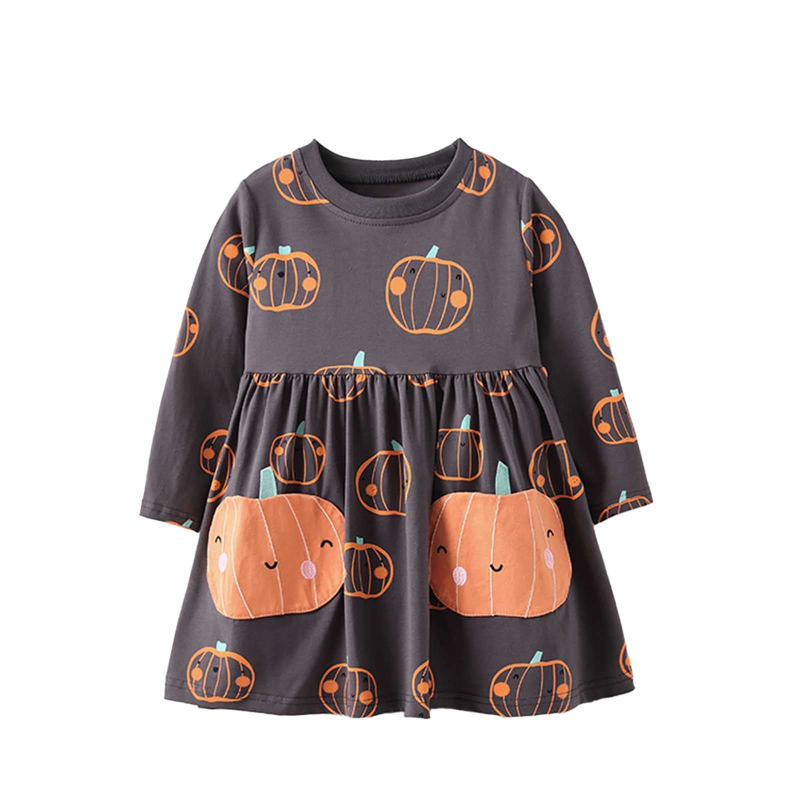 CAIVO Halloween Pumpkin Print Long Sleeve Girls Party Dress With Round
