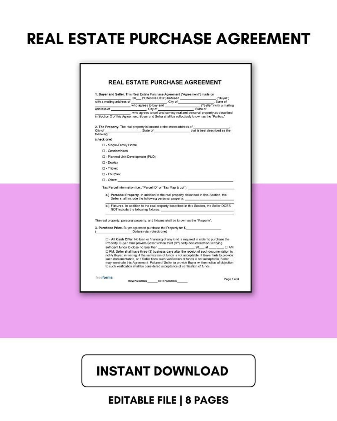 Real Estate Purchase Agreement Template Editable PDF Microsoft