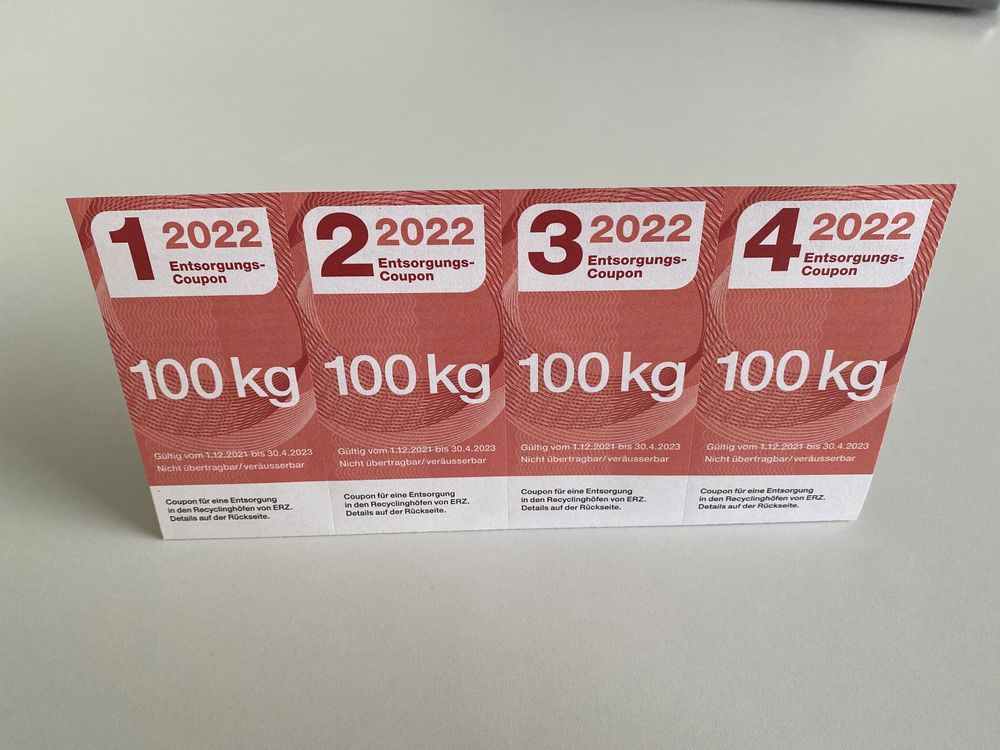 Stadt Zürich Entsorgung Recycling Coupons 2022 4 x 100kg (Neu und