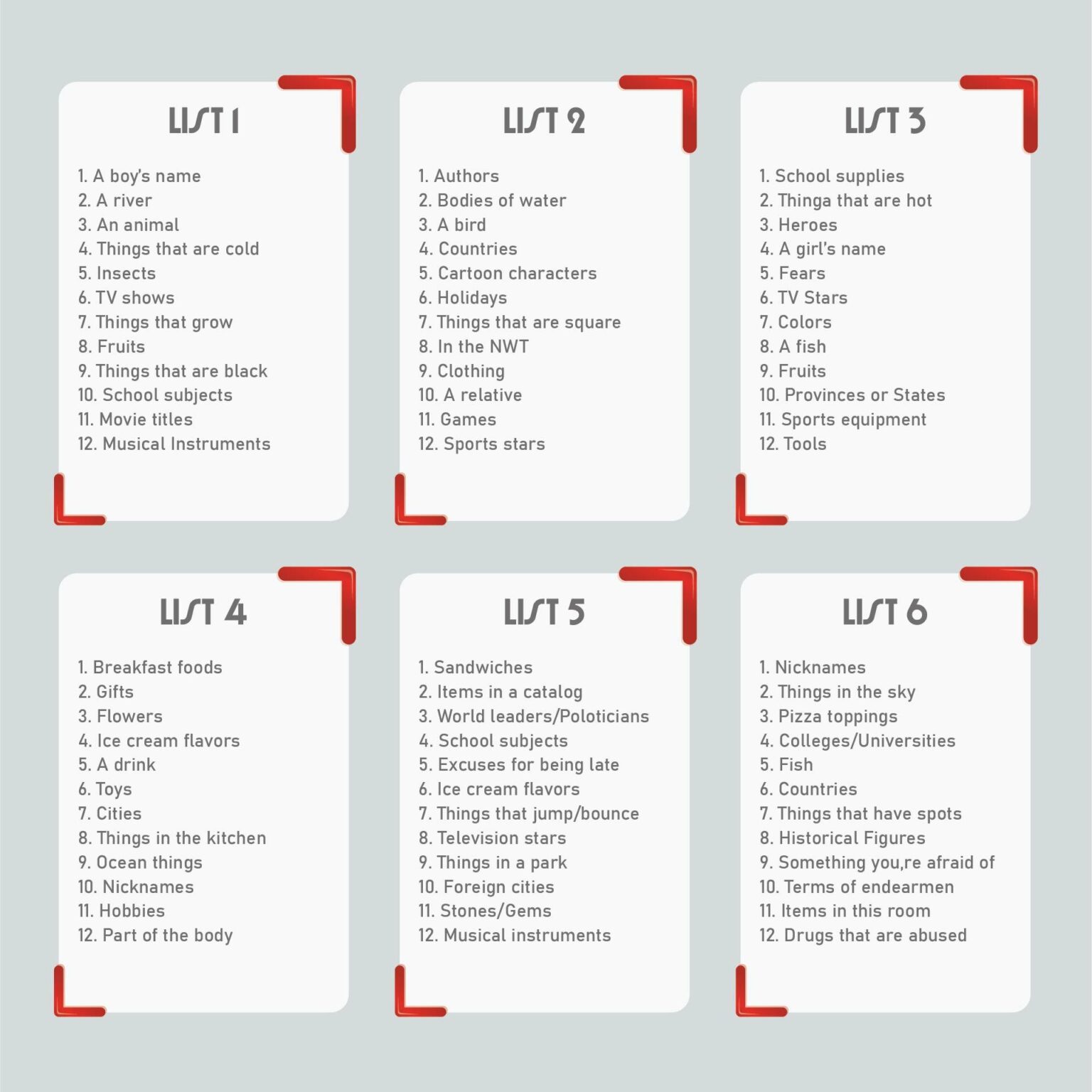 FREE Printable Scattergories Lists Instant Download 41% OFF