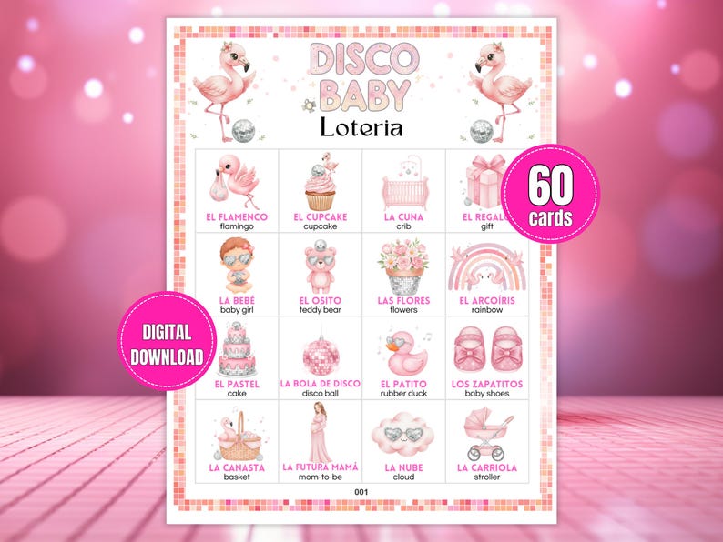 Girl Disco Baby Shower Loteria 60 Printable Boards Pink Flamingo