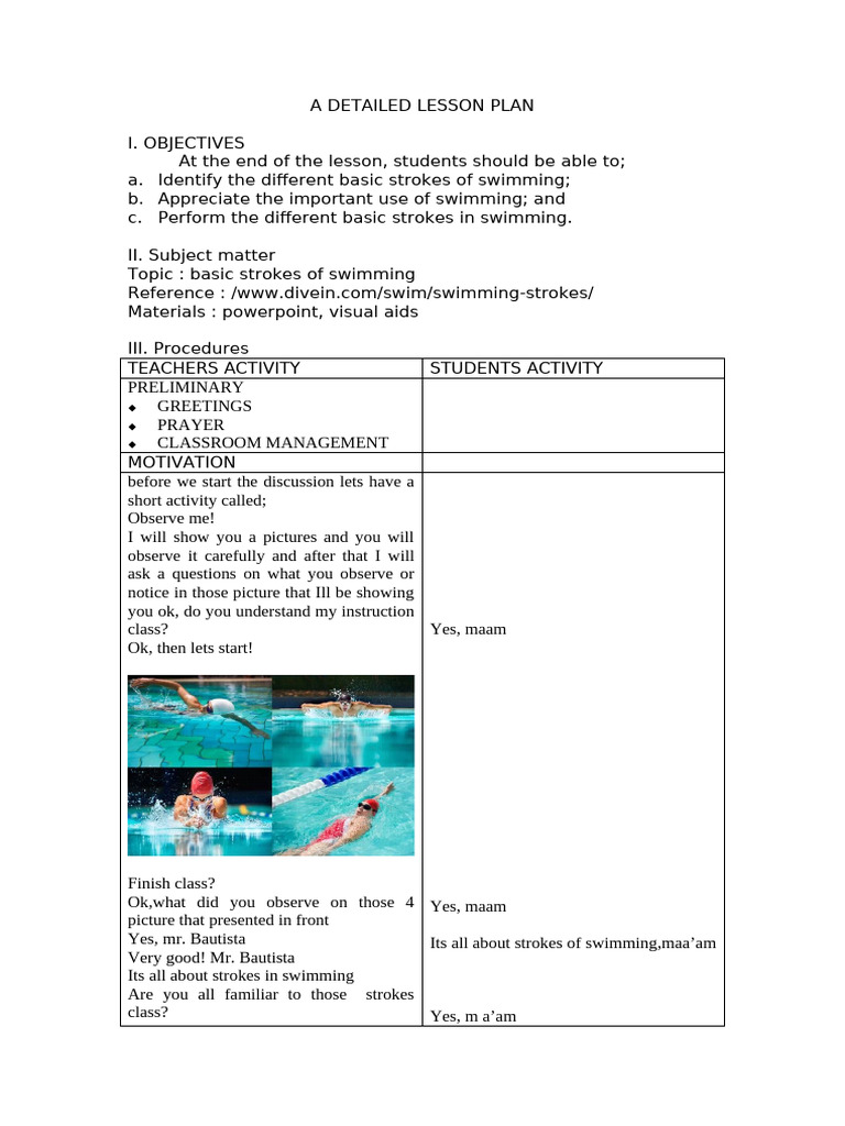 A DETAILED LESSON PLAN Swimming PDF