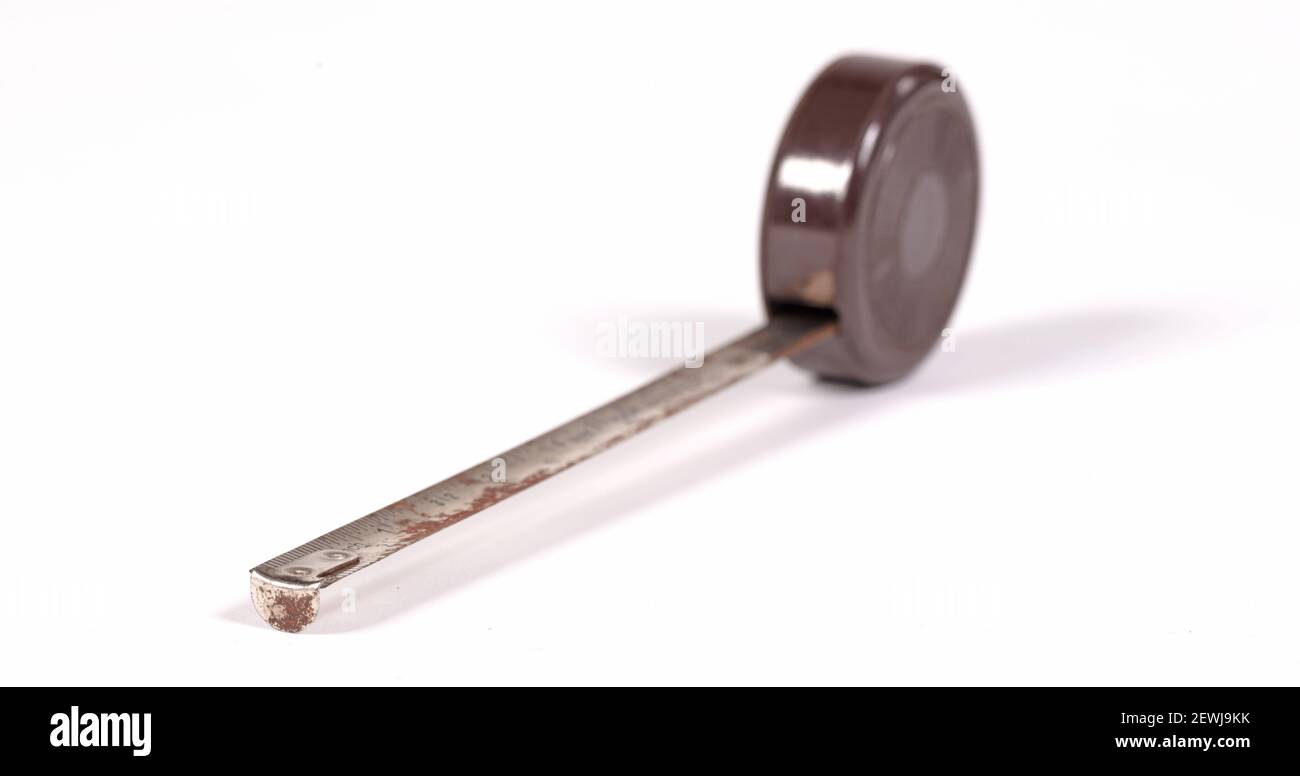 Old scratched brown metal tape measure measuring on white Stock Photo
