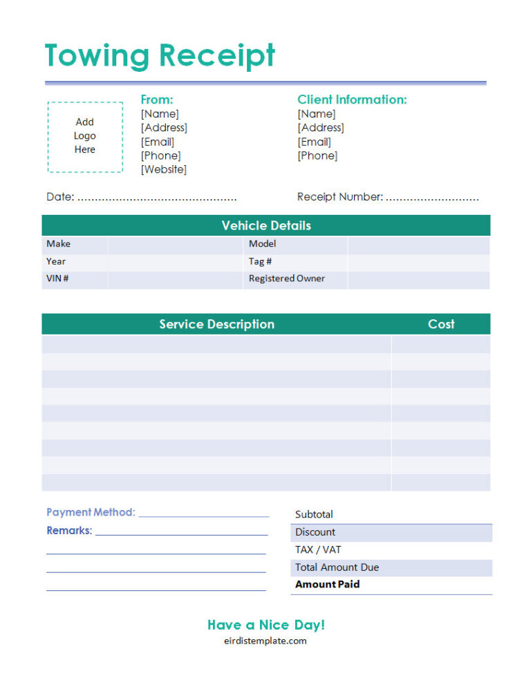 Free Printable Towing Receipt Template