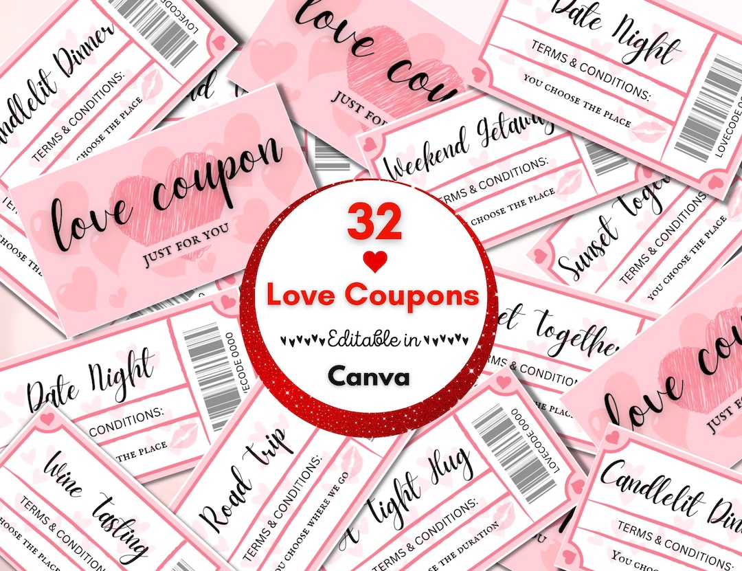 32 Love Coupons EDITABLE in Canva PRINTABLE Valentines Day Coupons