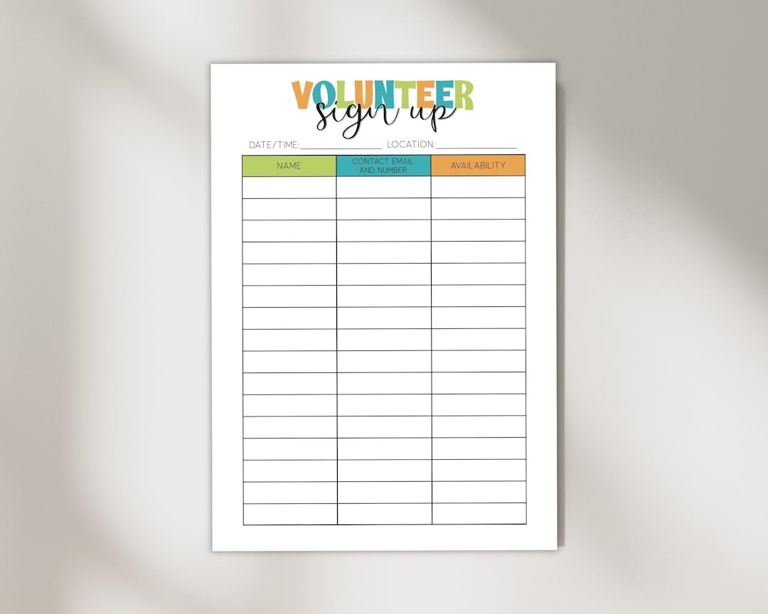 Volunteer Sign up Sheet Printable PDF Download Sign up Form for