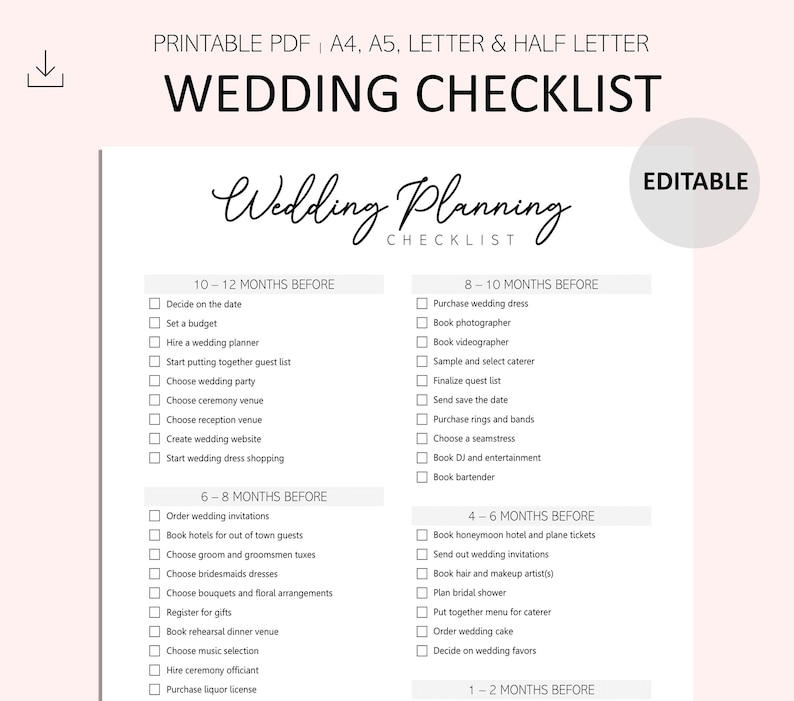 Wedding Checklist Printable Wedding Planning Template Download Etsy