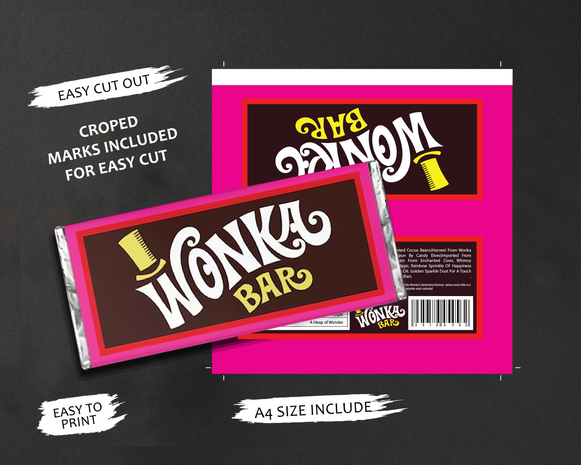 Wonka Pink Chocolate Bar Label 4 sizes DIY Wrapper instant digital