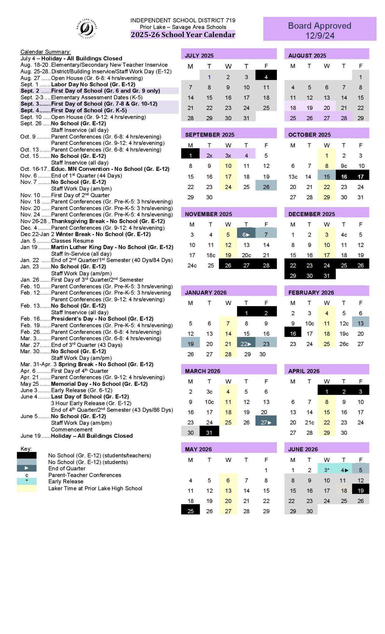 Prior Lake Schools Calendar 2025 2026 in PDF School Calendar Info