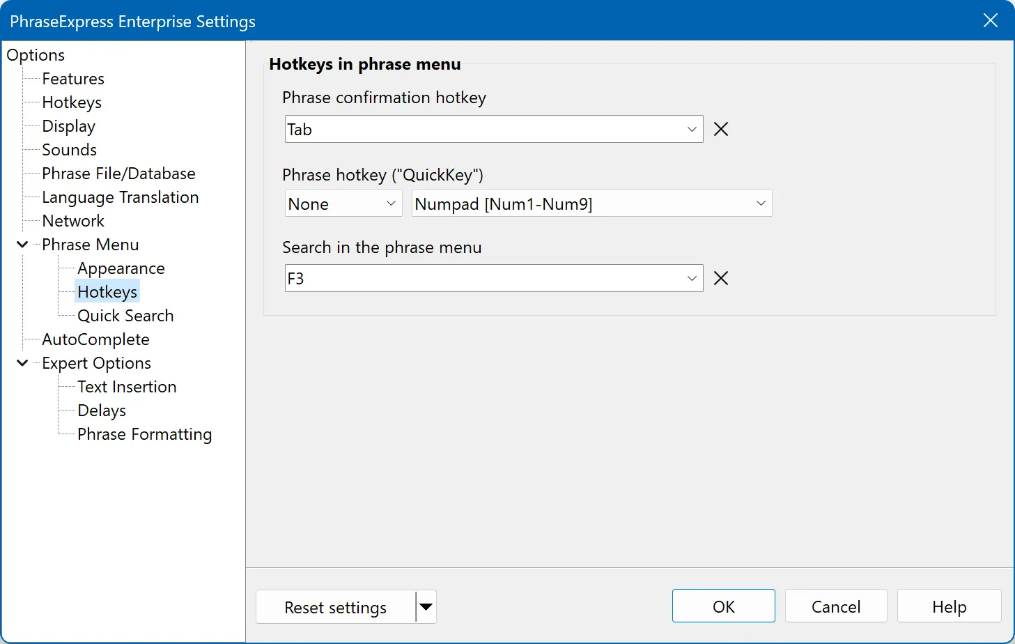 PhraseExpress Phrase menu