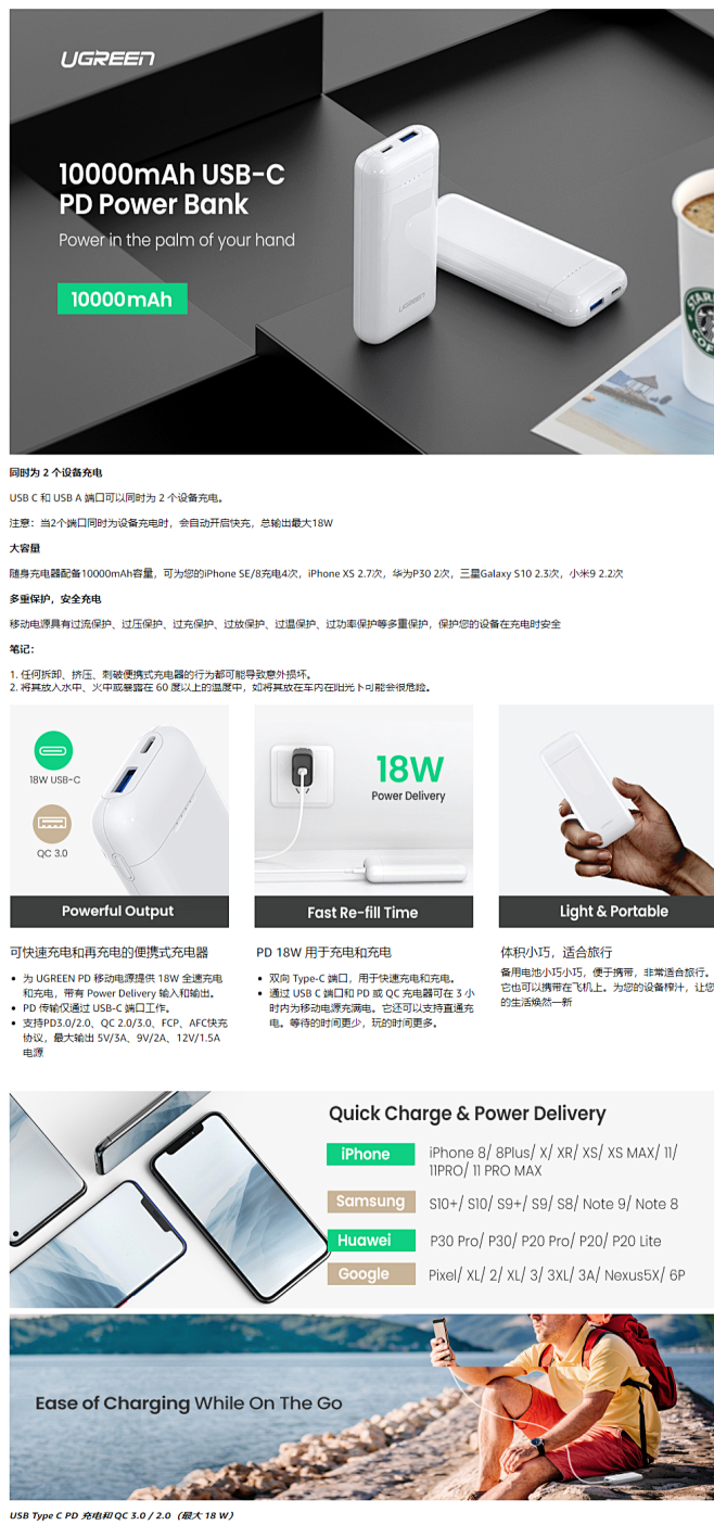 亚马逊:UGREEN 便携式充电器 10000mAh 电力传输 18W USB C 移动电源 PD 3 0 电池组 QC 3 0 快速充电兼容