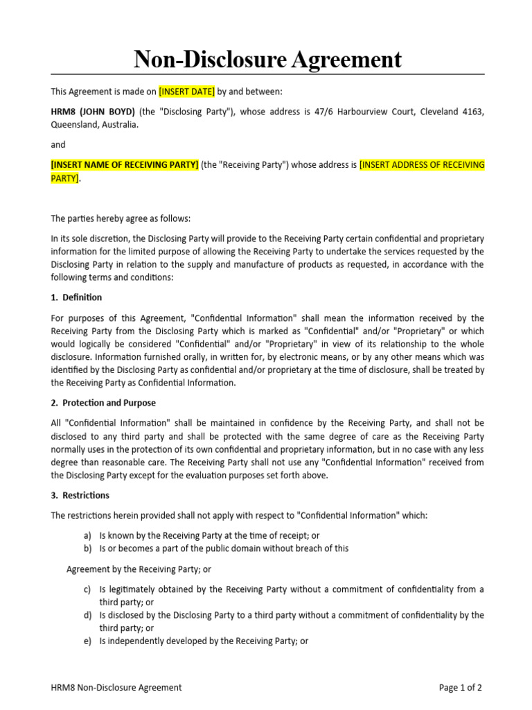 NDA Template HRM8 PDF Non Disclosure Agreement Civil Law (Legal