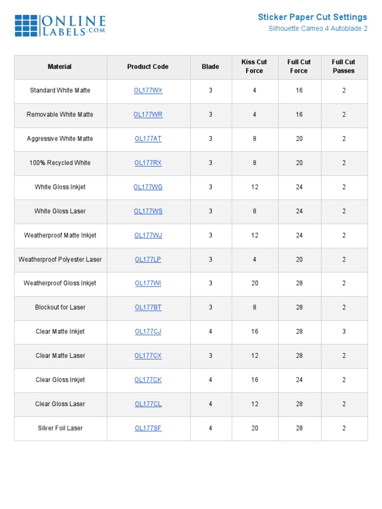 Sticker Paper Cut Settings: Material Product Code Blade Kiss Cut Force