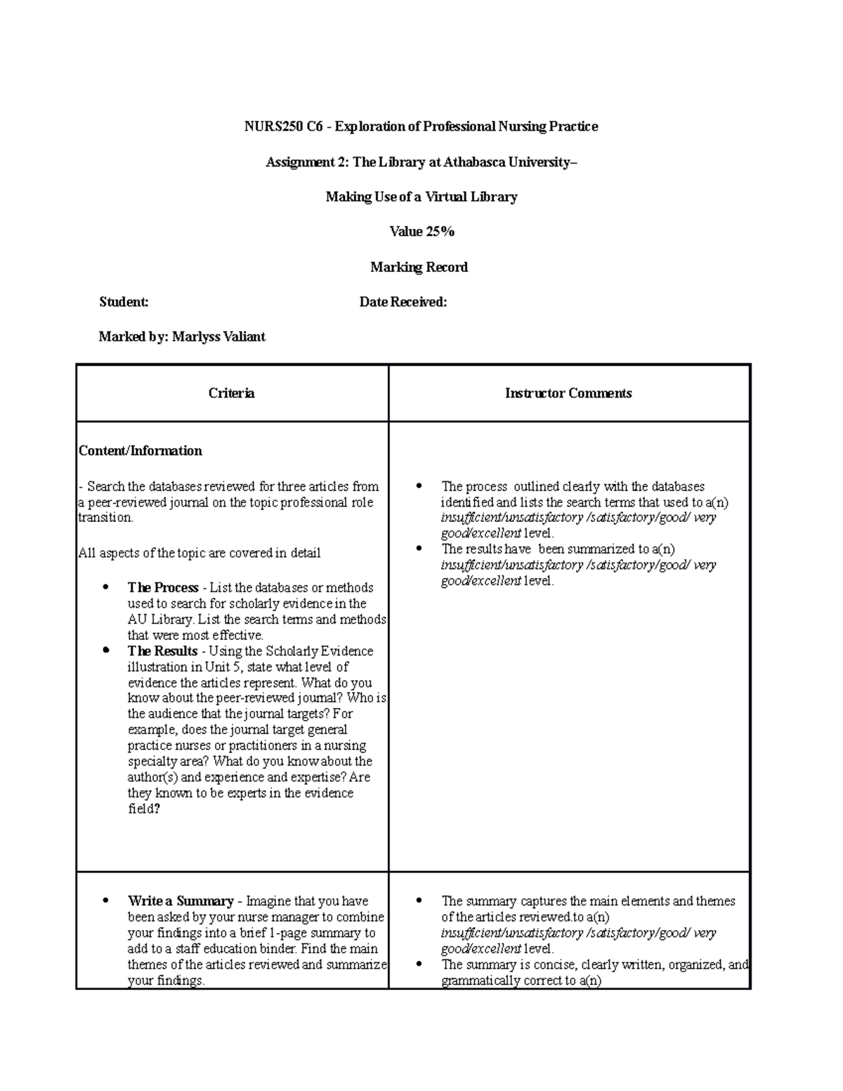 1Assignment 2 template NURS 250rubric 2023 NURS250 C6 Exploration