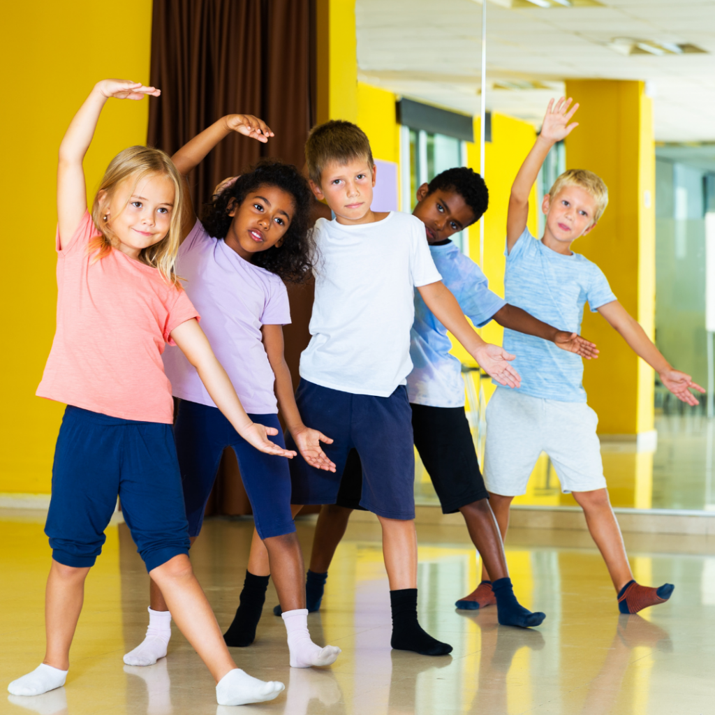 Group ofboys and girls training movements of slow foxtrot in
