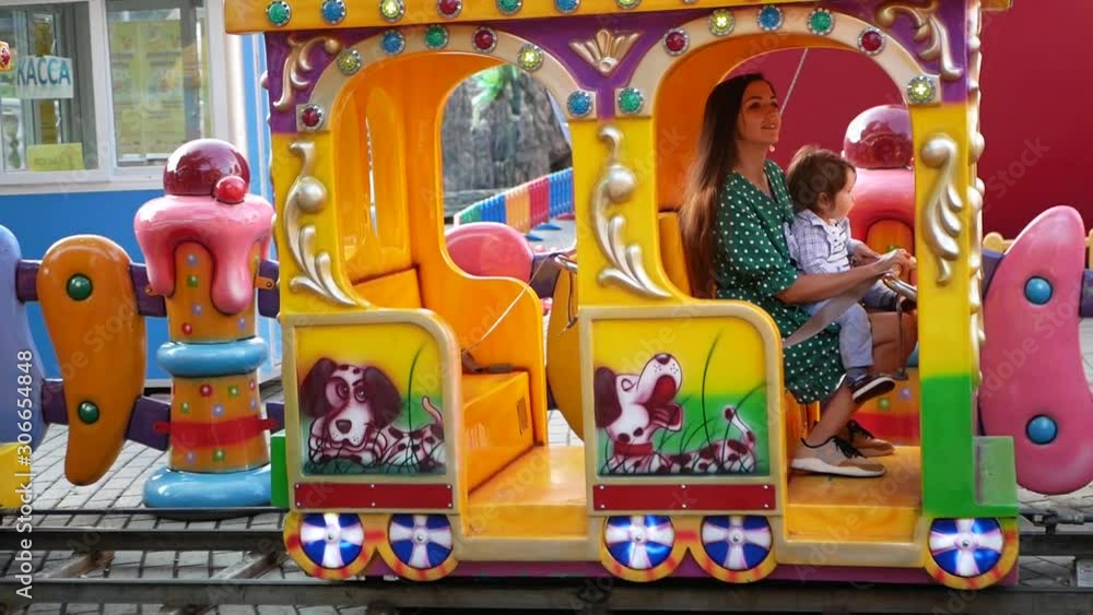 Mom rides with a child on a carousel A ride on a children #39 s train Mom