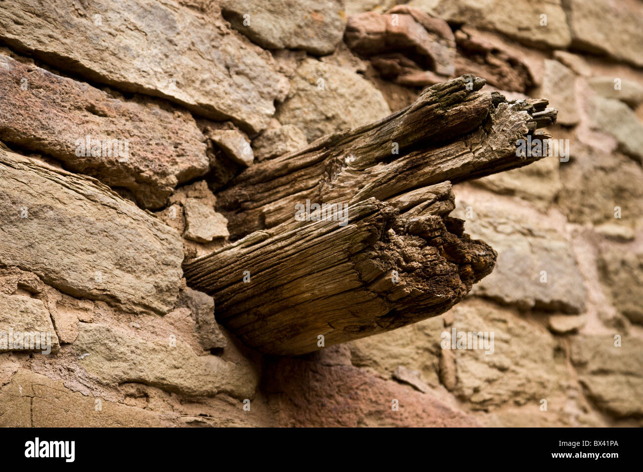 Wooden beam protruding through the walls of the Ancestral Puebloan