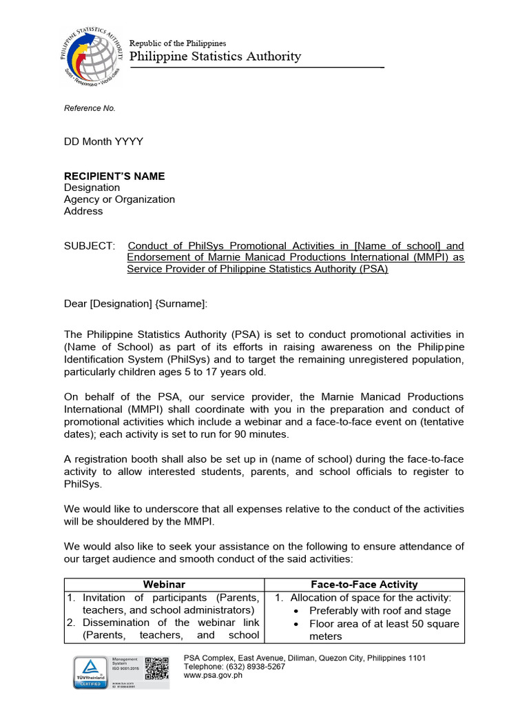 Template Endorsement Letter of PSA To DepEd For School Registration