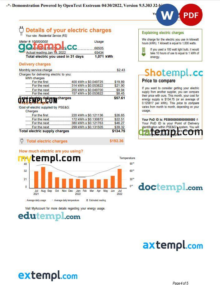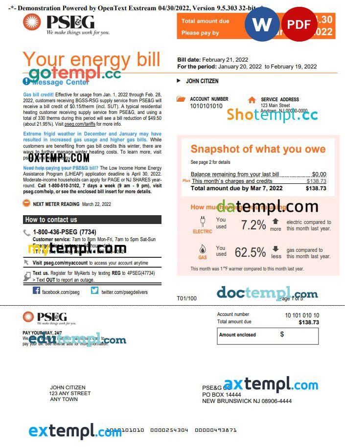 USA New Jersey PSEG electricity utility bill template in Word and PDF