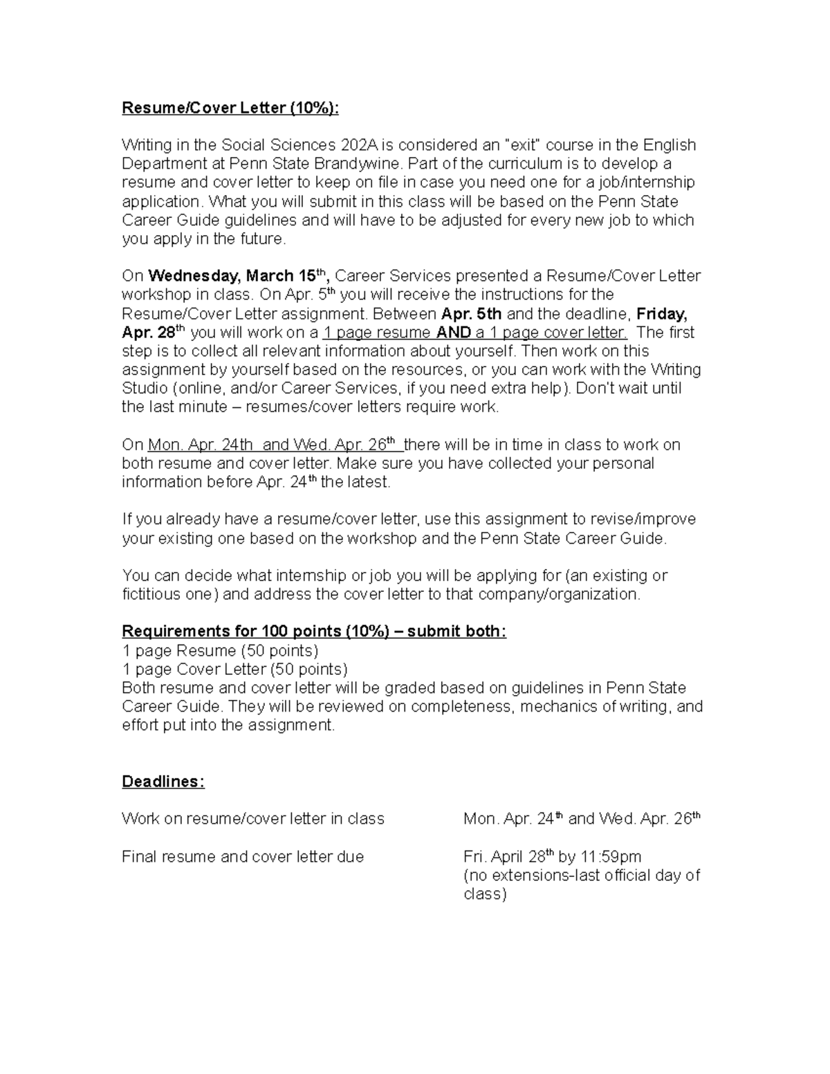 PSU 202A Resume Guidelines Resume/Cover Letter (10%): Writing in the