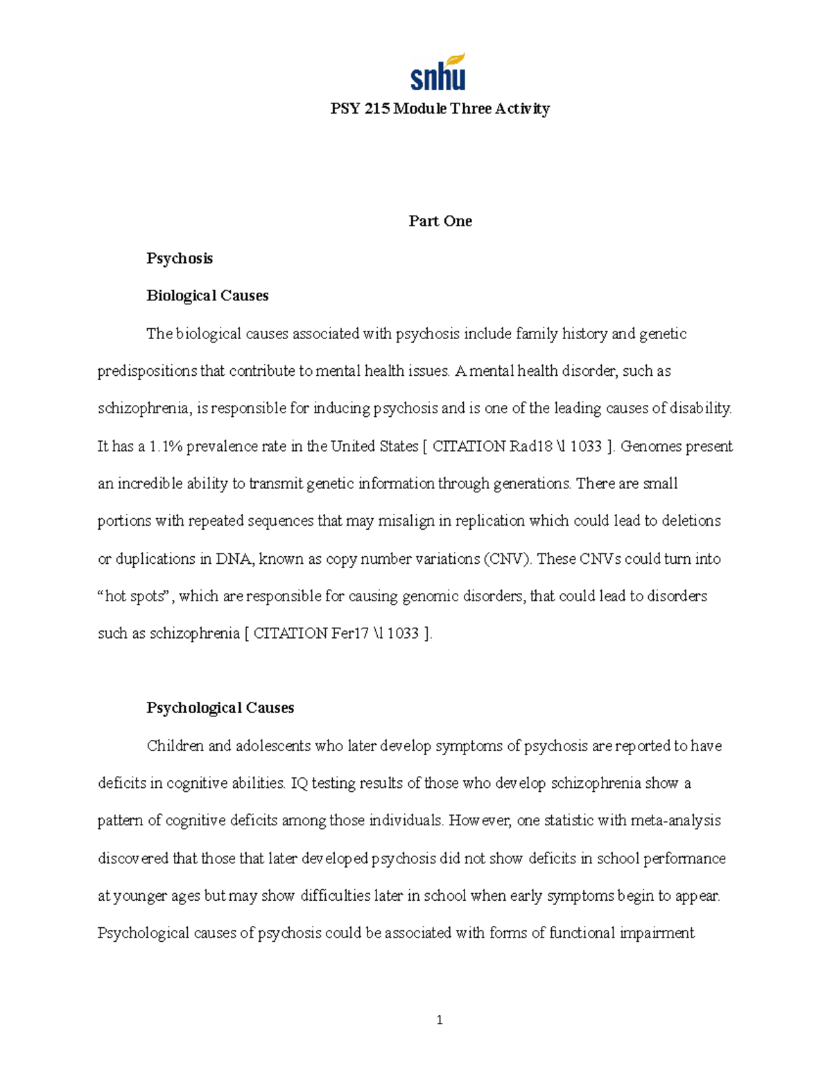 PSY 215 Module Three PSY 215 Module Three Activity Part One Psychosis