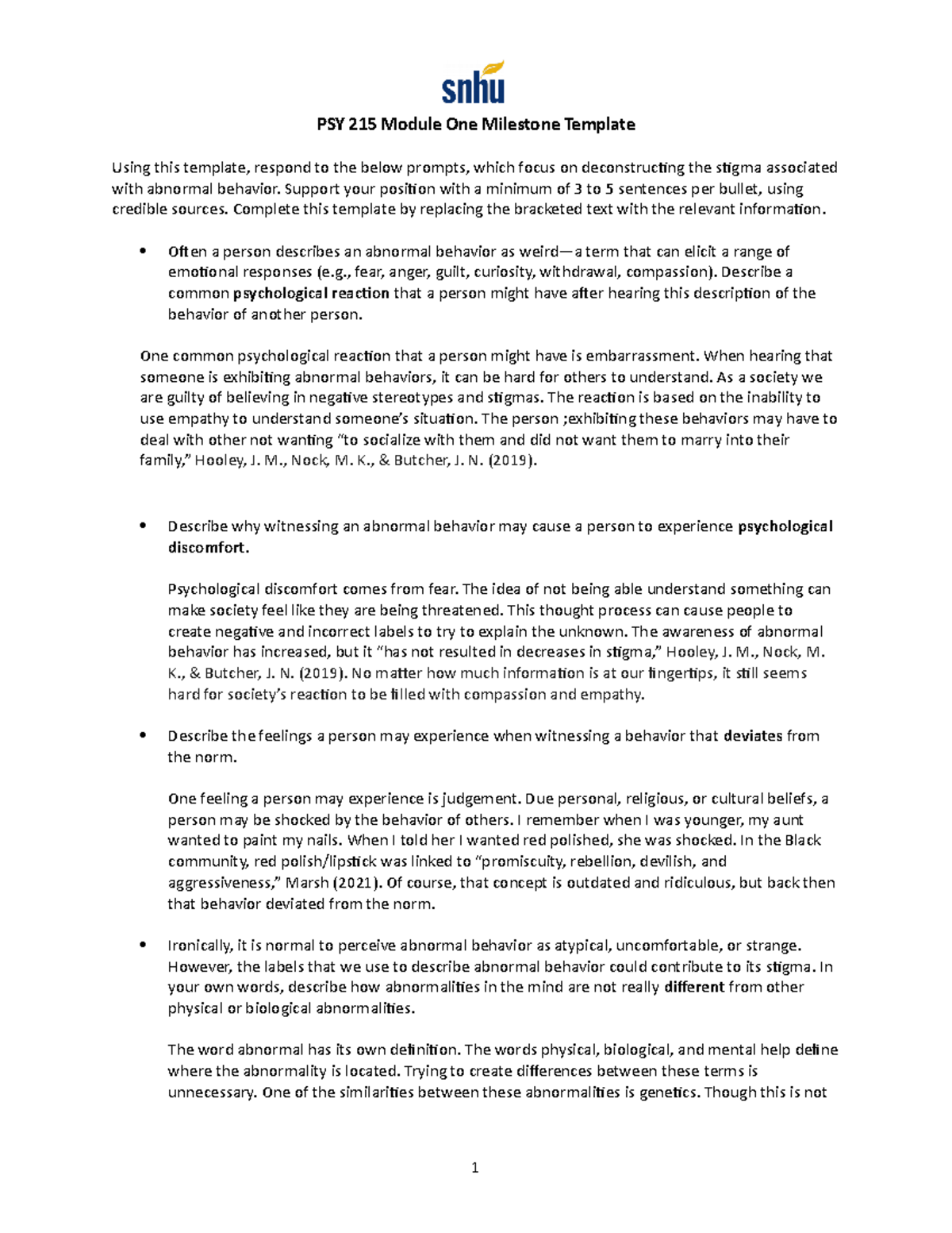 PSY 215 Module One Milestone Template PSY 215 Module One Milestone