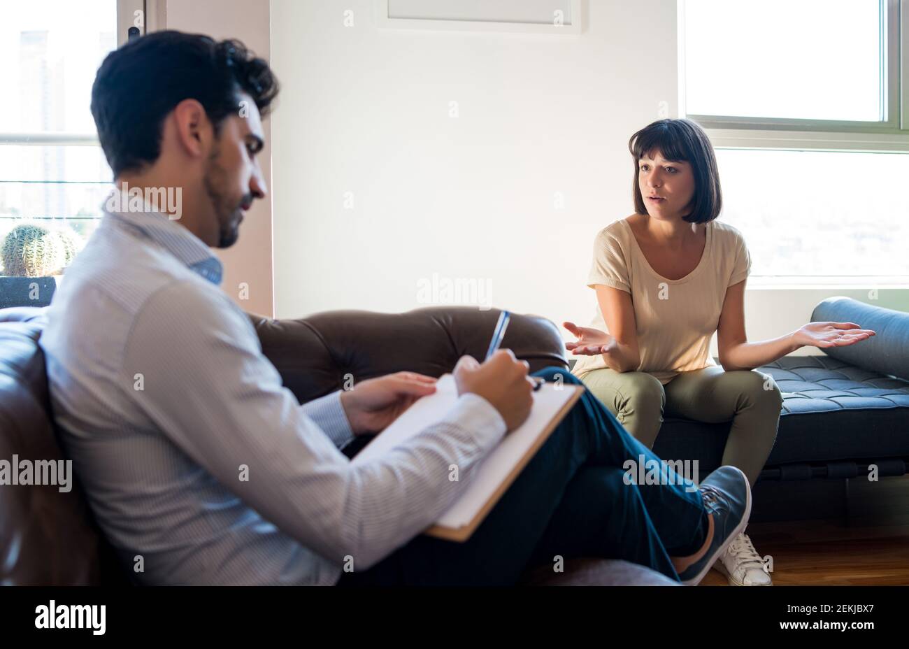 Psychologist talking with patient on therapy session Stock Photo Alamy