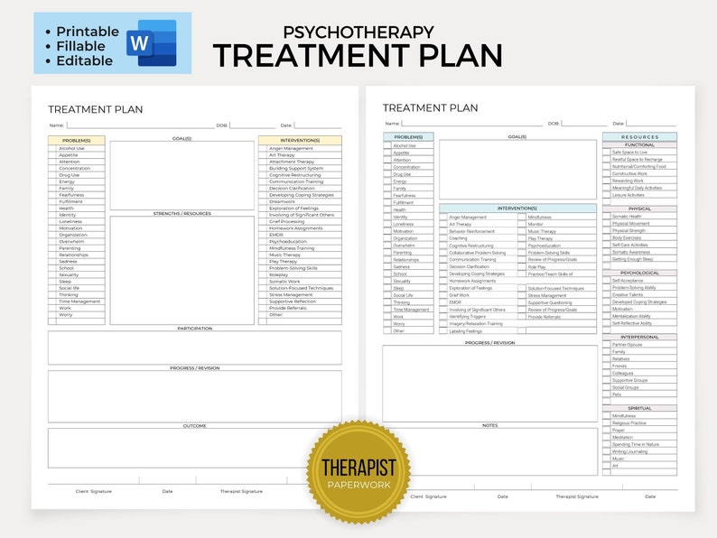 Psychotherapy Treatment Plan Editable Word Template Etsy