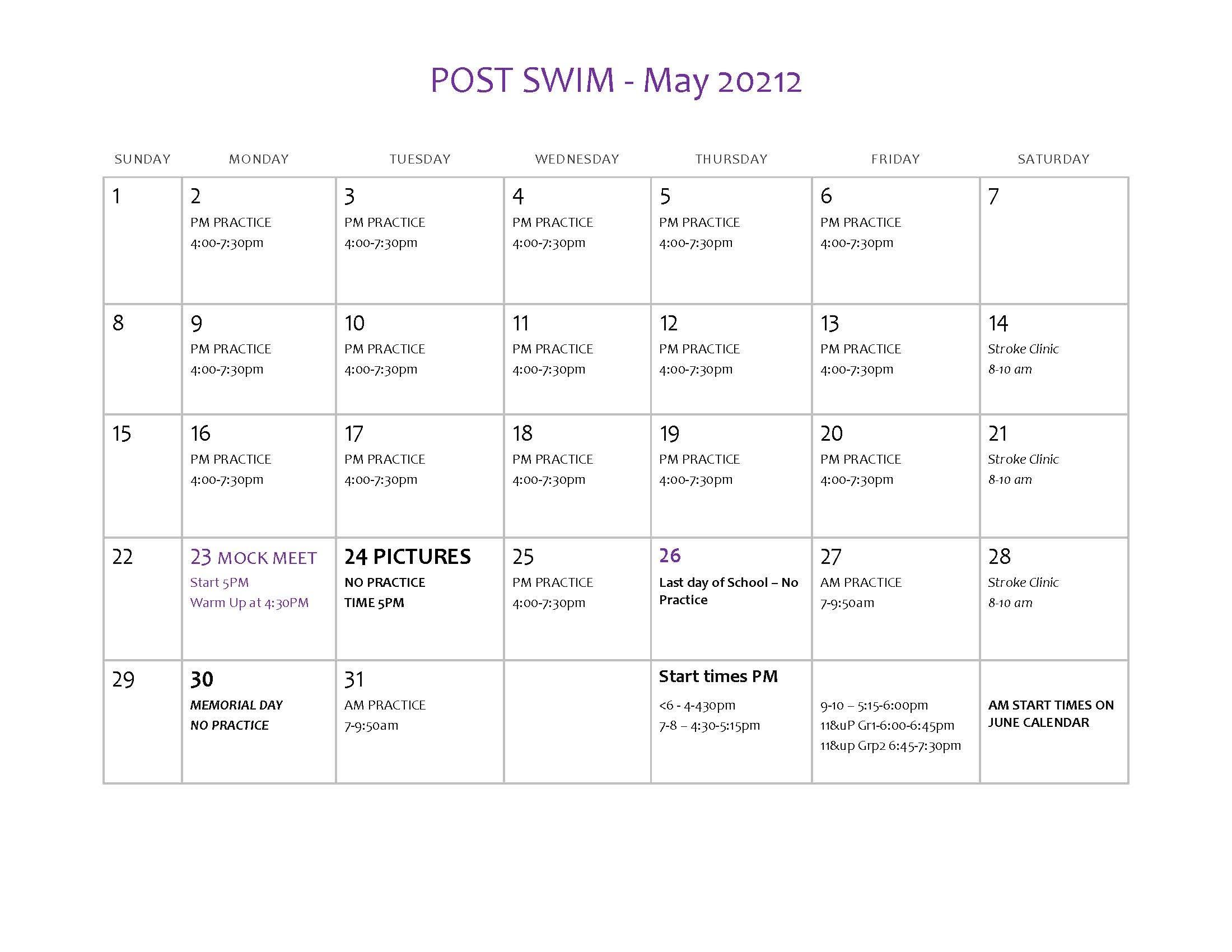 Calendar Practices Super Sharks Swim Club