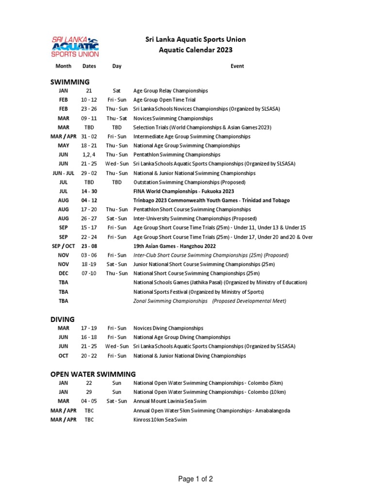 Aquatic Calendar 2023 PDF Games Of Physical Skill Water Sports