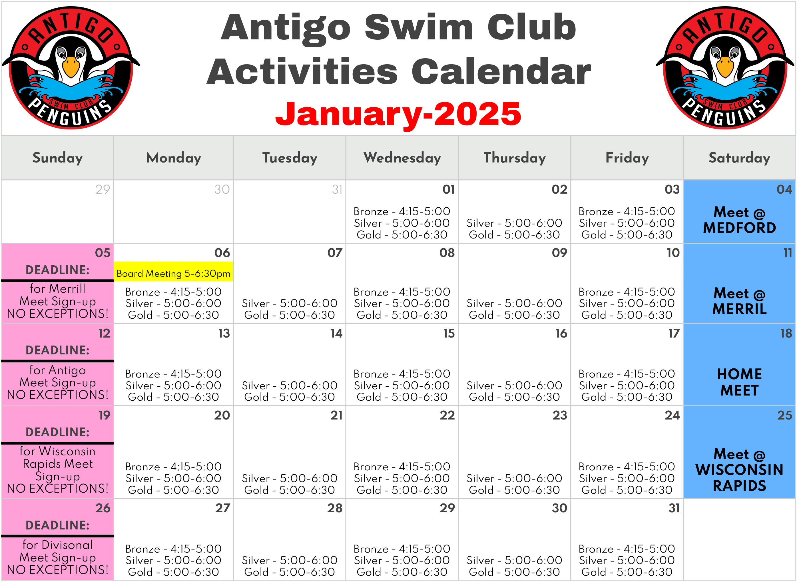 Activities Calendar Antigo Swim Club