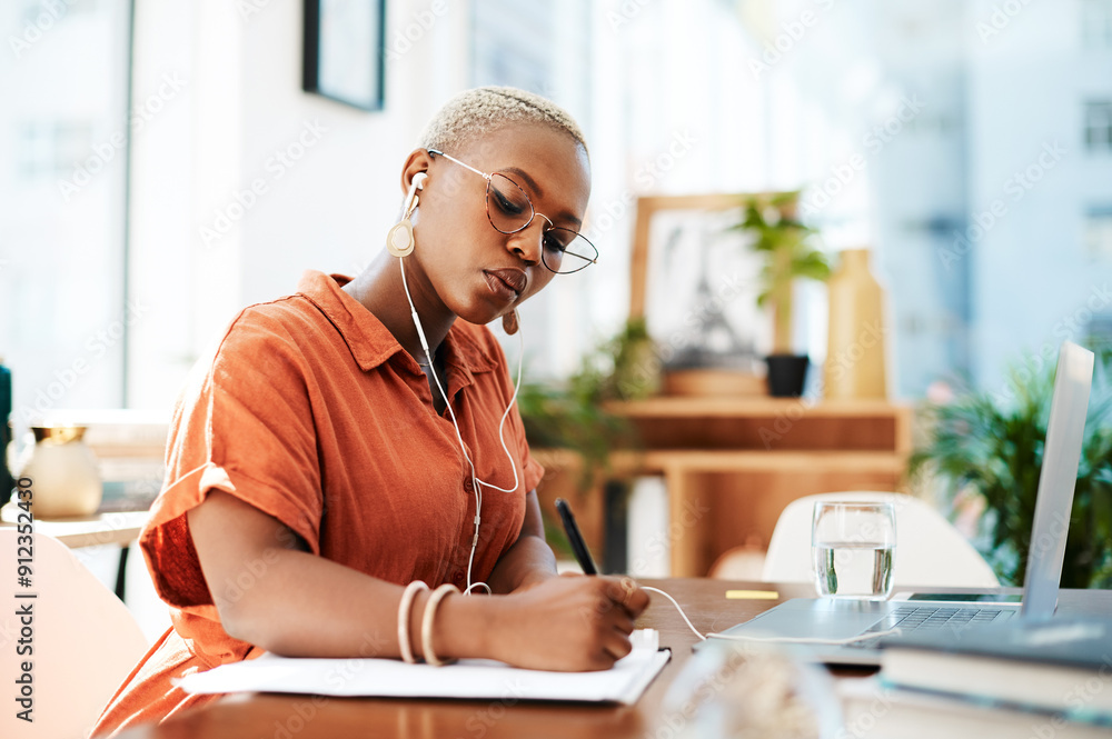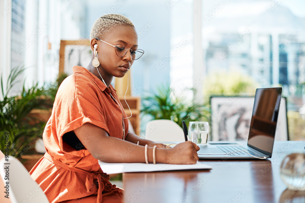 Writing Business and Black Woman at Desk with Documents for Assessment