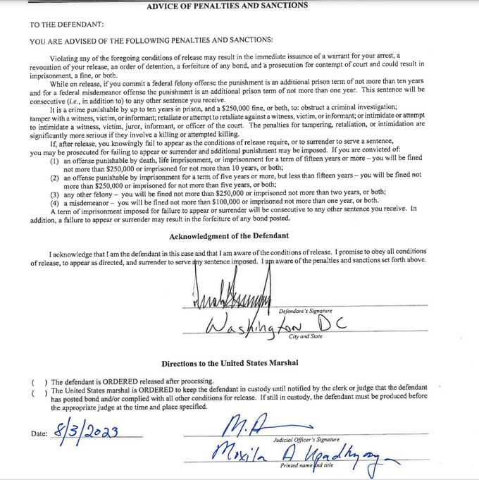 Here is Donald Trump #39 s signature on the conditions of his release