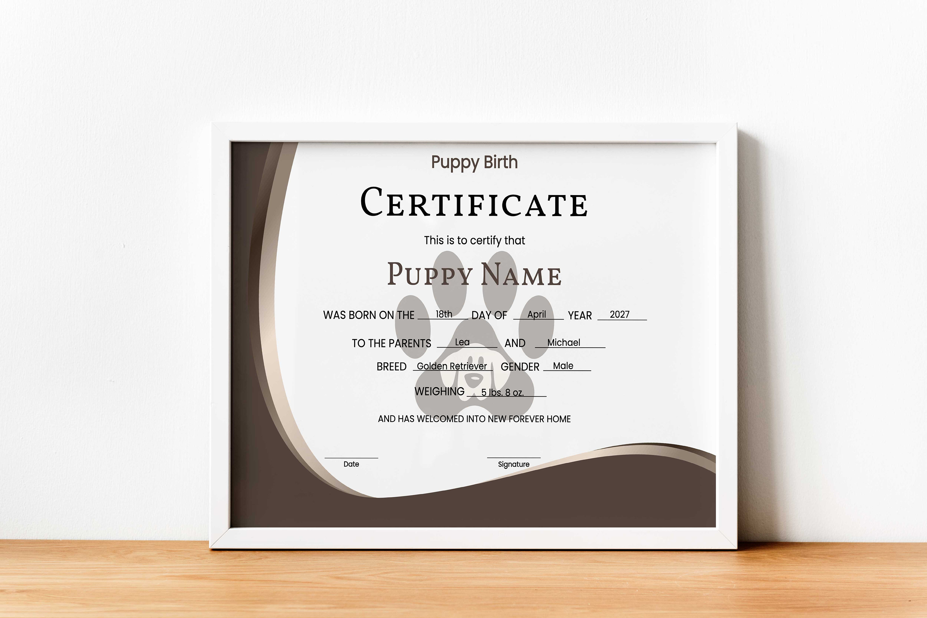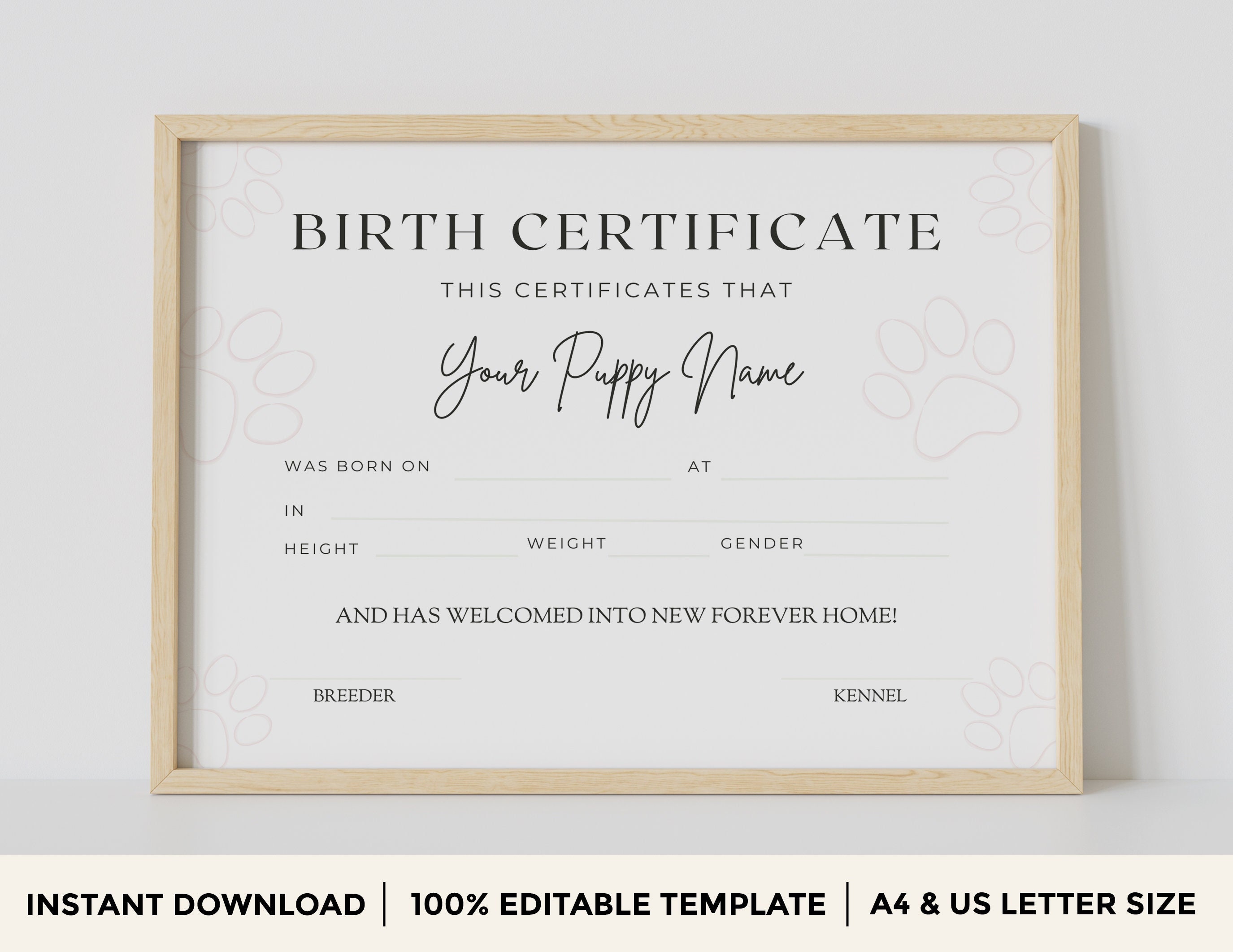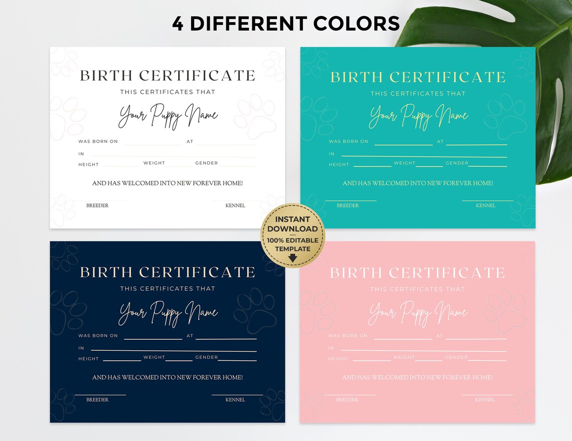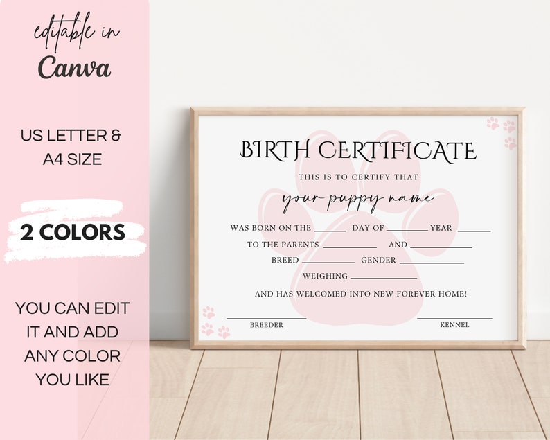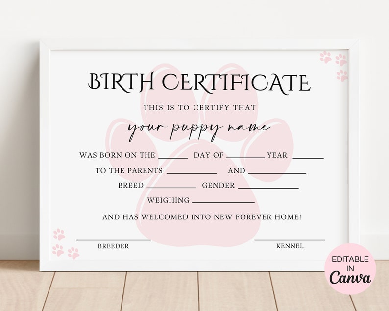 Custom Puppy Birth Certificate Template Editable Printable Paw