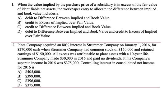 Solved 1 When the value implied by the purchase price of a Chegg com