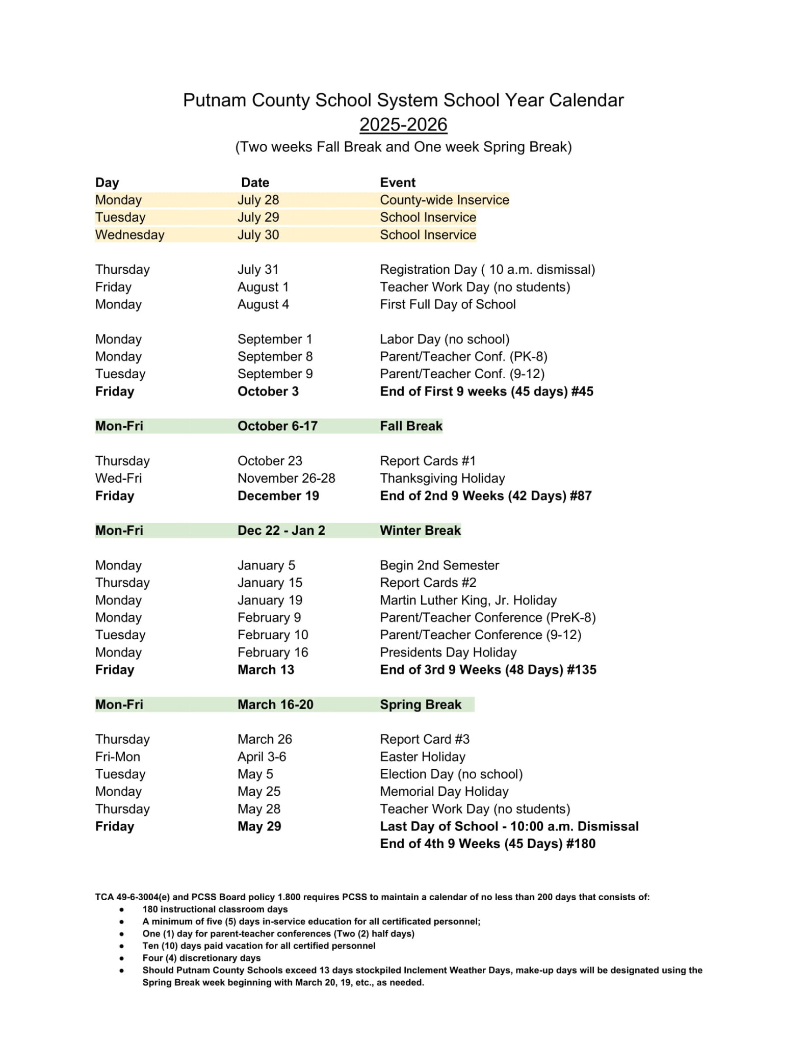 Putnam County tn Schools Calendar 25 26 Revised PDF EduCounty