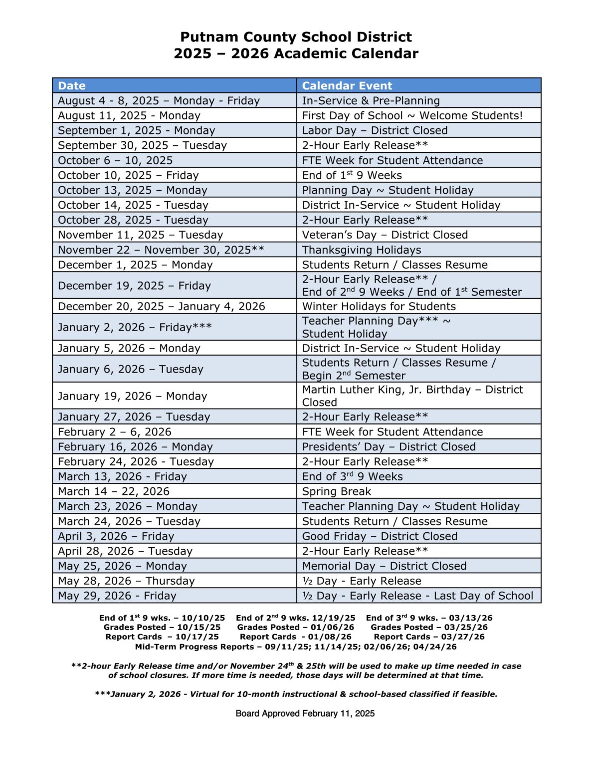 Putnam County Schools Calendar 2025 2026 Elementary