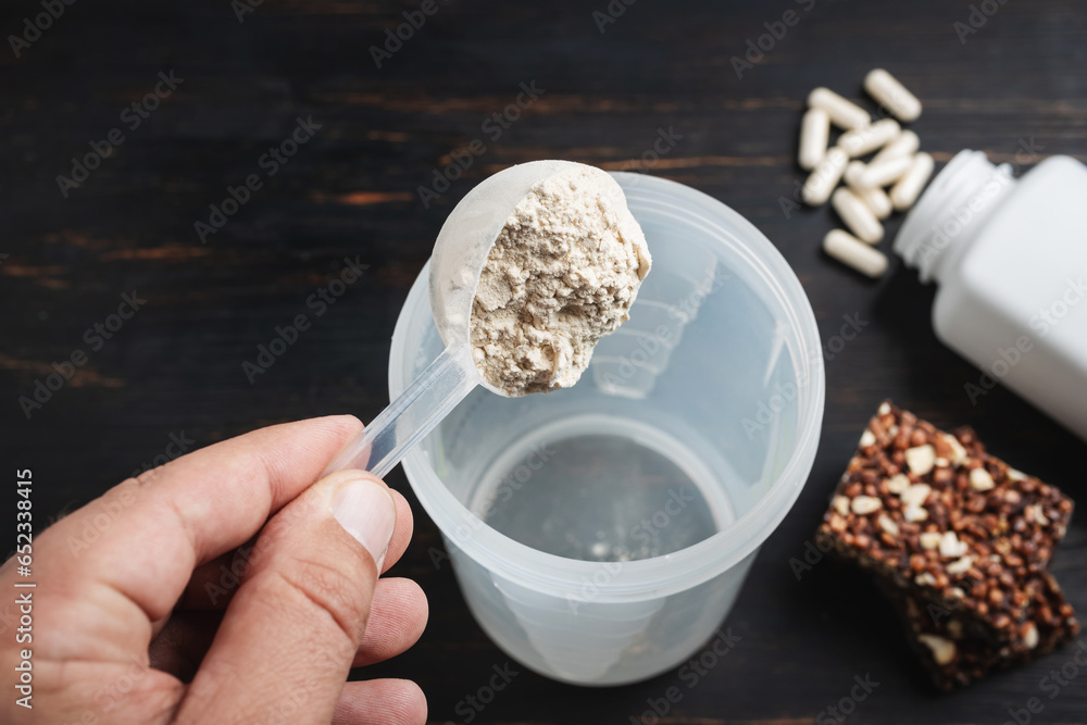 Male hand puts into a shaker scoop portion of whey soy protein powder