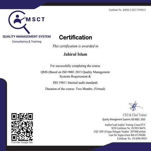 CERTIFICATE OF Jahirul Islam pdf Quality Management Syestem ISO 9001: