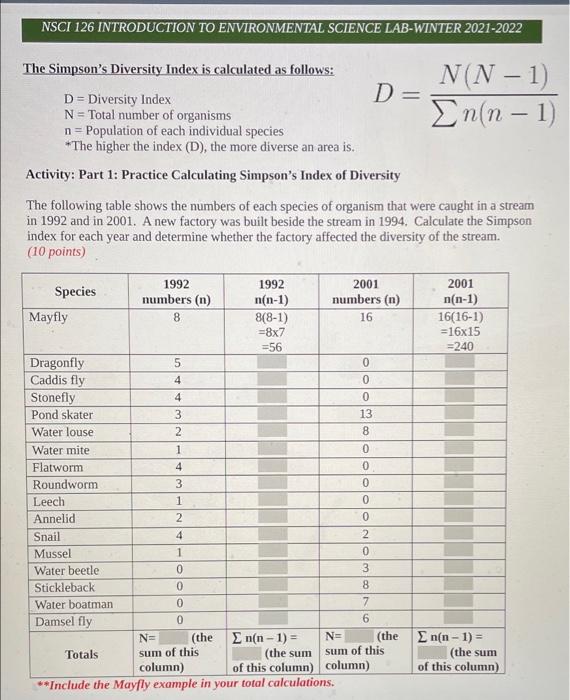 Solved QUANTIFYING BIODIVERSITY: SIMPSON #39 S DIVERSITY INDEX Chegg com