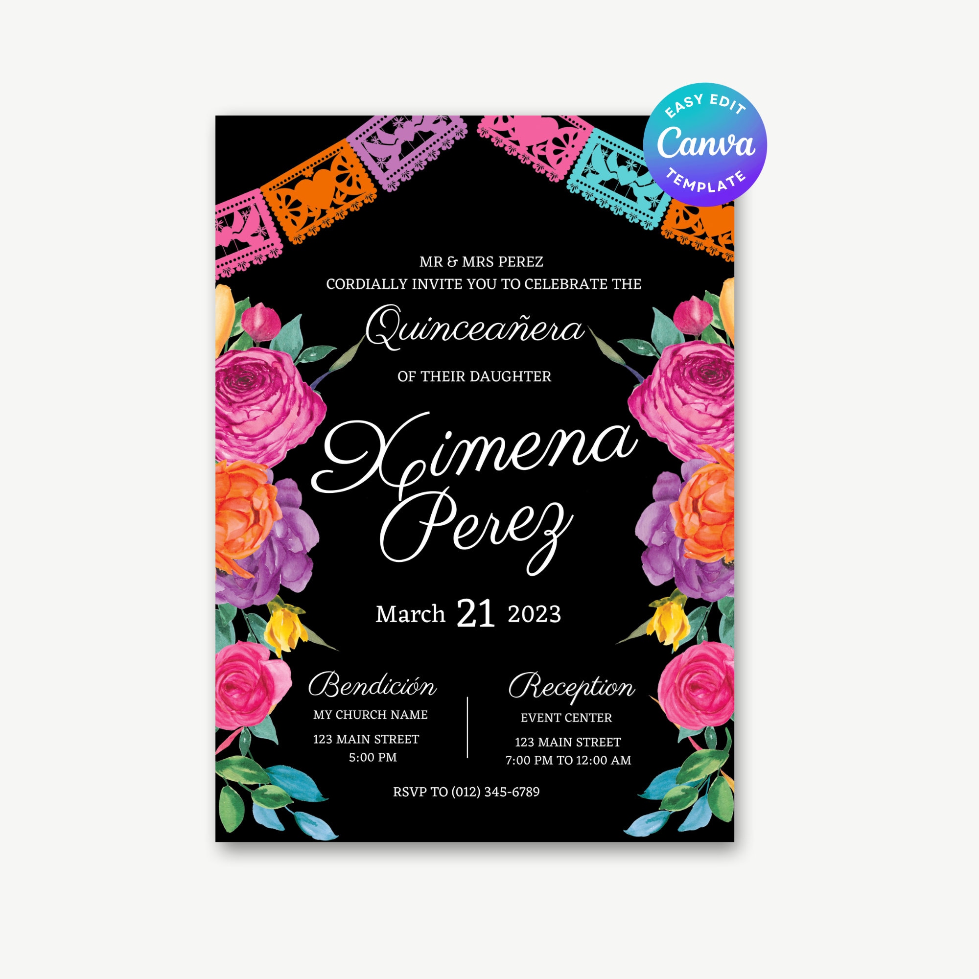 Editable Quince Invitation Fiesta Quinceanera Black Mexican Quince