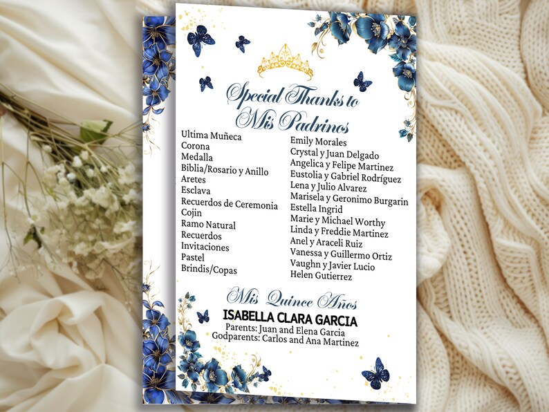 EDITABLE Program Template Elegant Royal Blue Gold Floral Quinceanera
