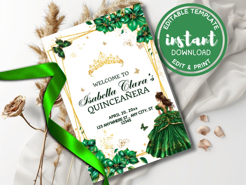 Emerald Green Quinceañera Program Template Printable Quince Program