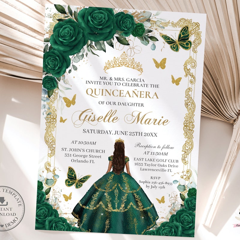 Green Gold Quinceañera Invitation: Editable Template (digital